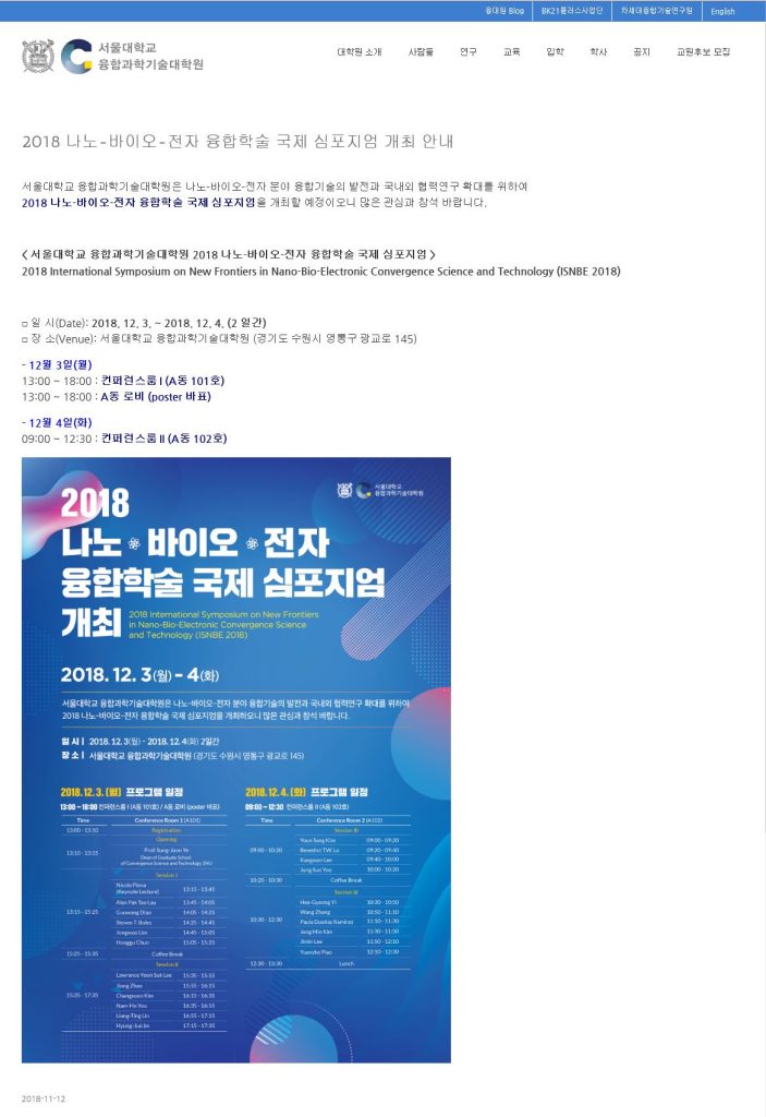 (2) 2018 International Symposium on Nano-Bio-Electronic Convergence Science and Technology. Graduate School of Convergence Science and Technology, Seoul National University. Republic of Korea. December 3~4, 2018.